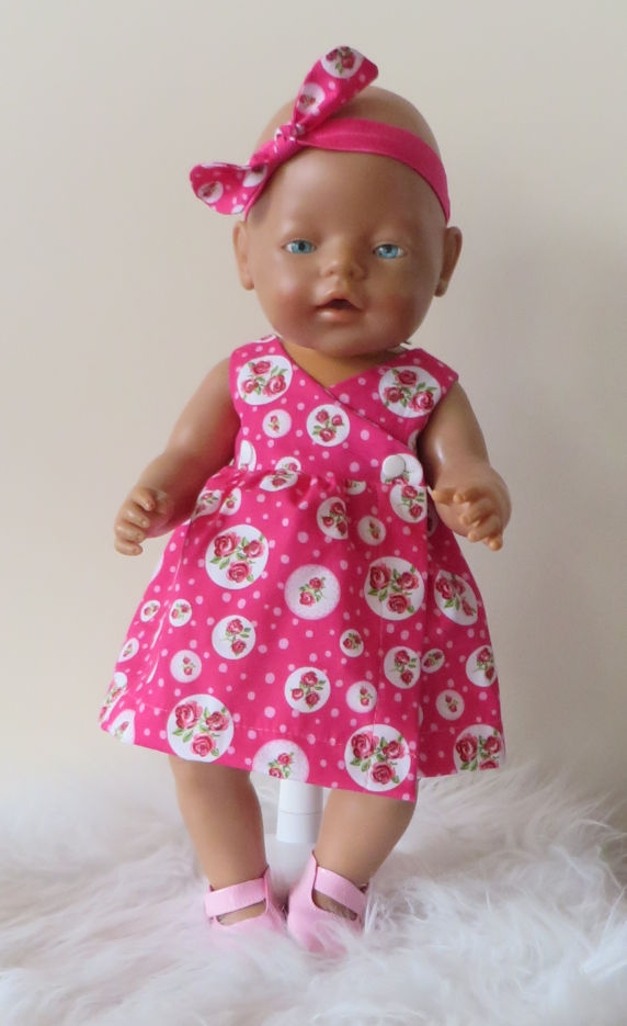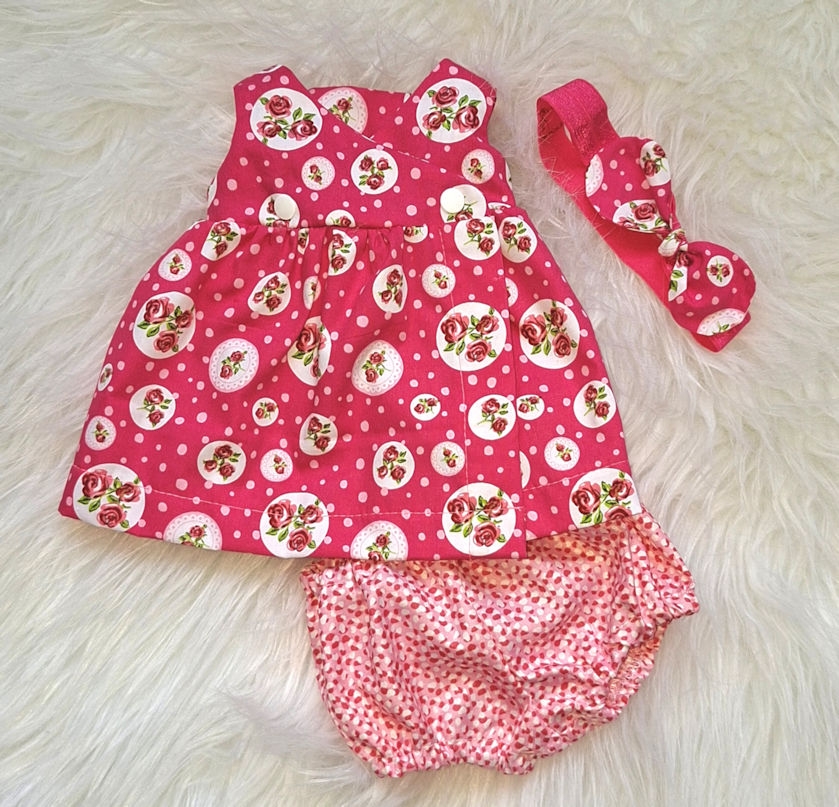 Roze zomerjurk. De overslagjurk sluit met drukkertjes. Erbij een bloomers (=ballonbroekje) en een hofdbandje.
