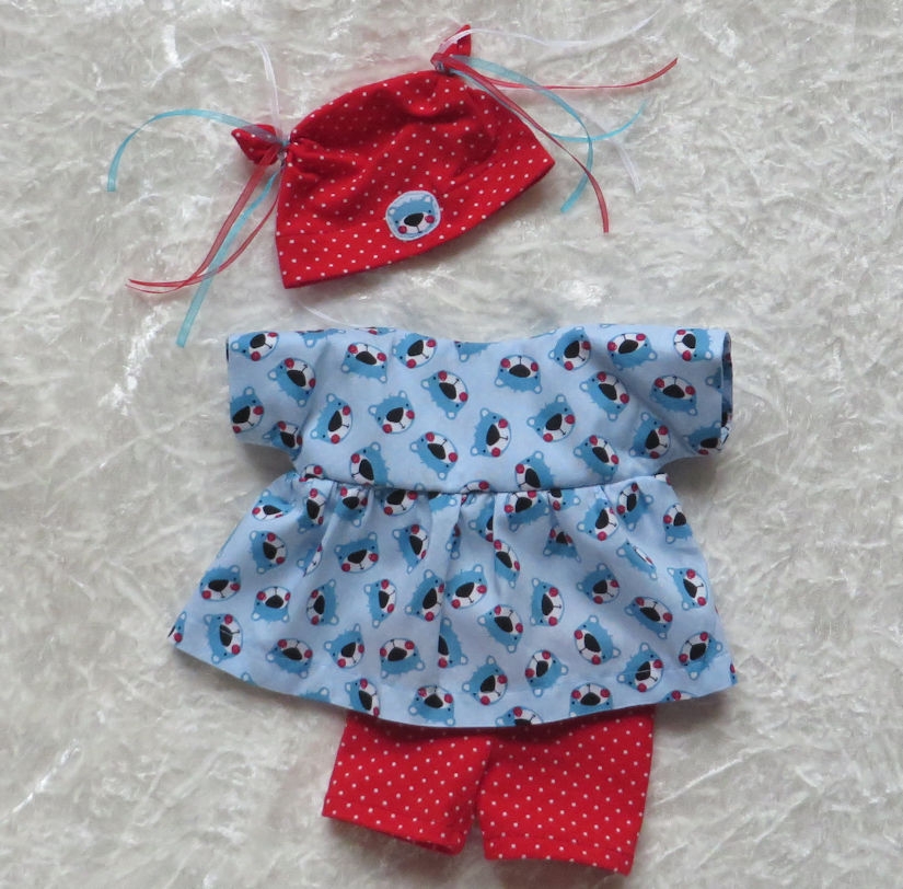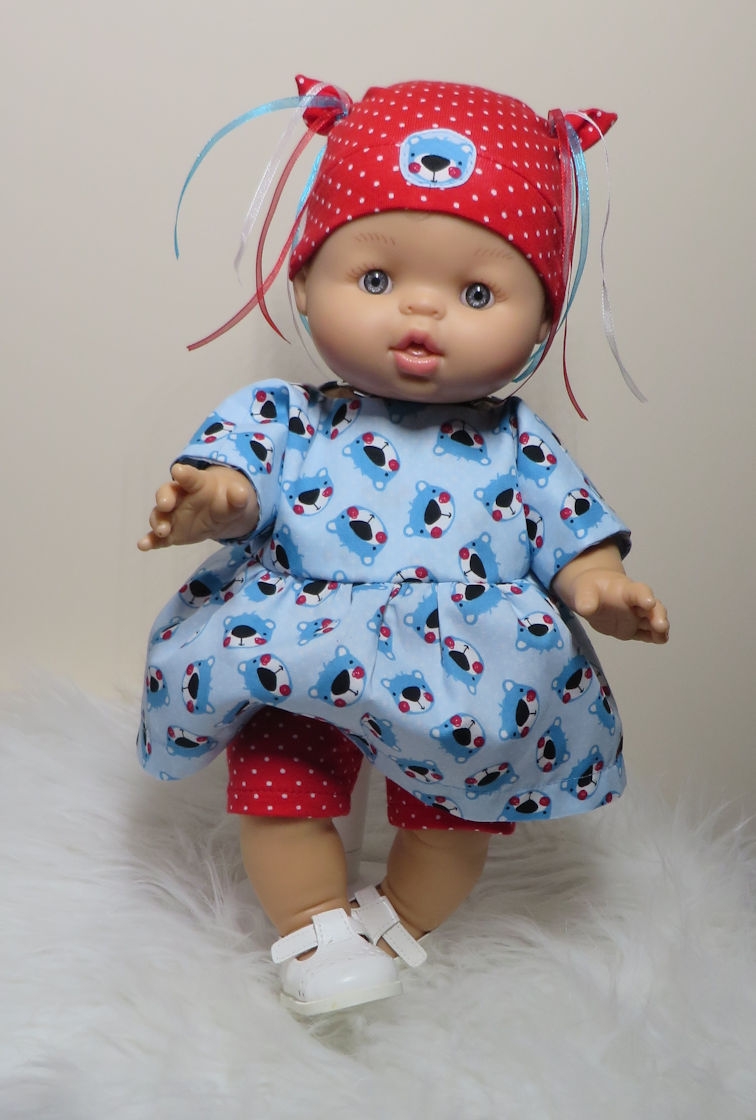 Een vrolijk driedelig setje voor de Paola Reina Gordi pop. Een jurk met berenhoofdjesEen legging, rood met witte stippen.En een bijpassende muts met lintjes.