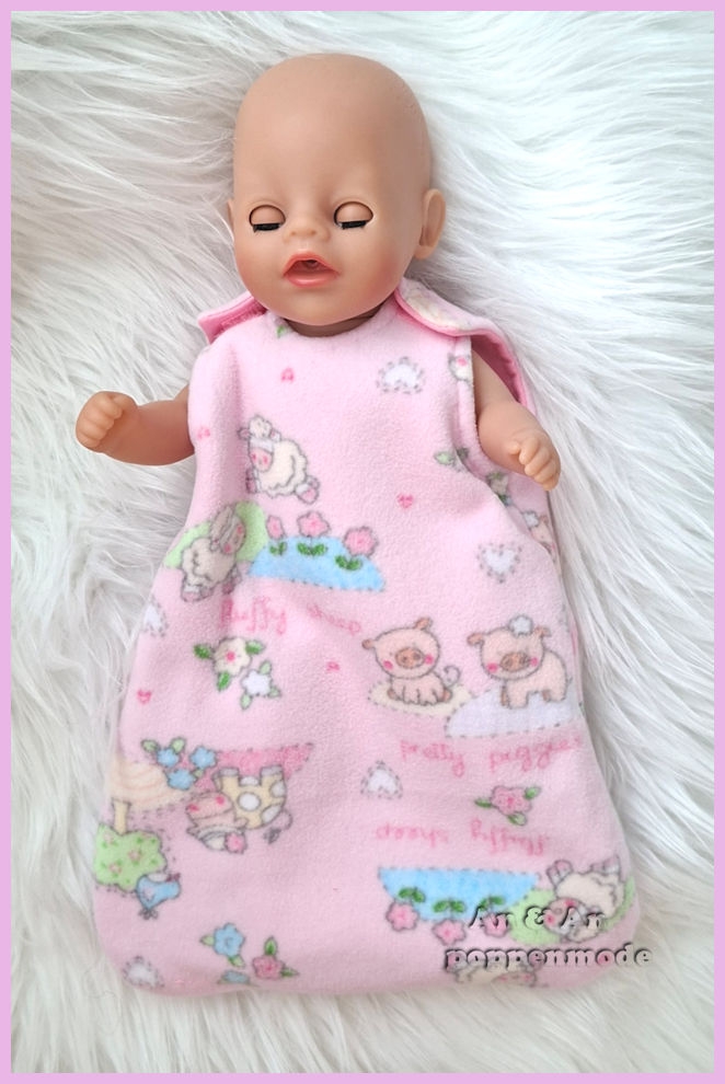 Een hele zachte slaapzak past de babyborn van 30 cm.Gemaakt van zacht roze fleece met boerderijdieren print.Geheel gevoerd met roze tricot.Sluit op de schouders met klittenband