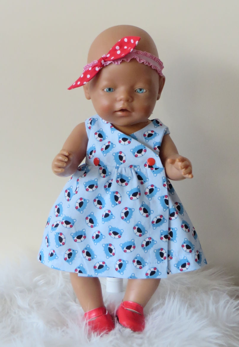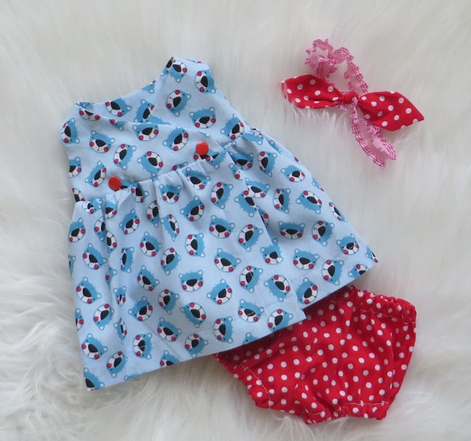 Een jurk met een print van berenhoofdjes.Met daarbij een bloomers (pofbroekje) en een hoofdband.De overslagjurk sluit met drukkertjes