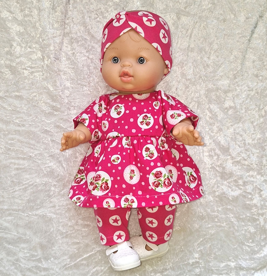 Dit setje past de Paola Reina Gordi pop van 34 cm en bestaat uit: een jurk een legging en een bijpassende hoofdband