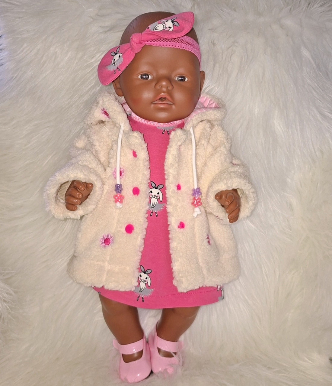 Warm teddy jasje, wolwit met geborduurde bloemetjes.Jasje heeft capuchon en sluit met drukkertjes.Jurk met bijpassende hoofdband.Past de babybornpop van 43 cm