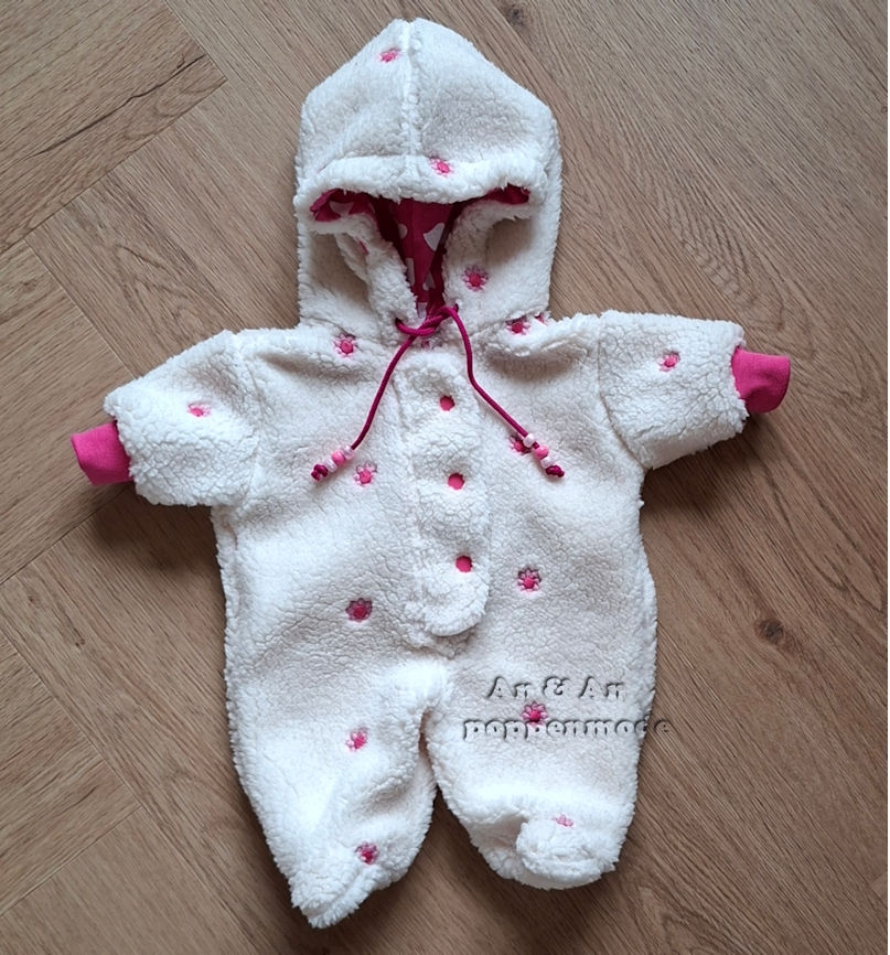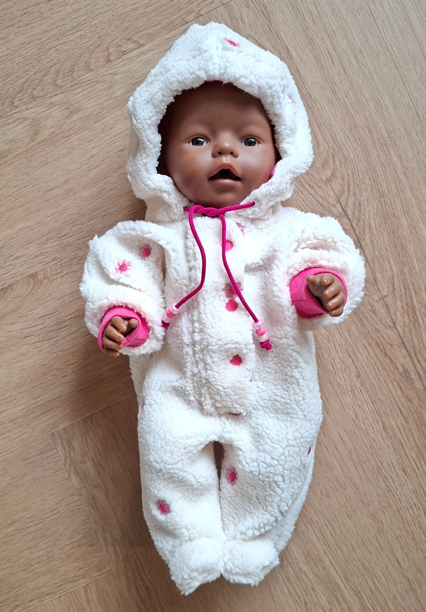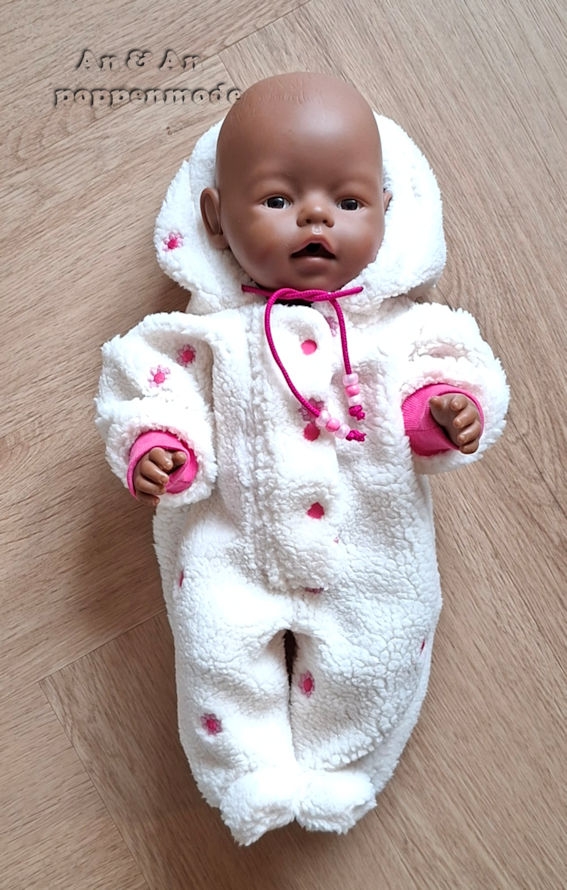 Een lekker warm pak van wolwitte teddy.Met capuchon en voetjes.Past de babybornpop van 43 cm.